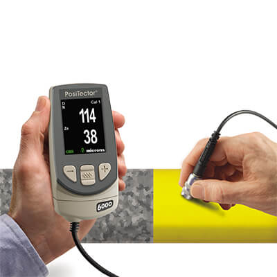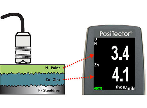 The PosiTector 6000 FNDS probe measures the individual thicknesses of both the paint and the zinc layers in a duplex coating system with a single reading. |