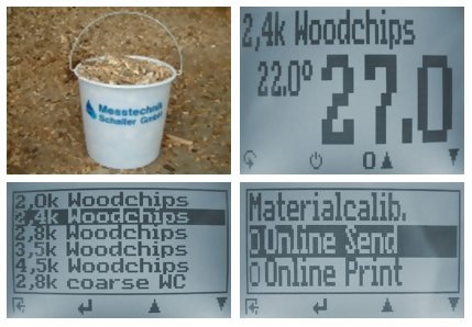 | Name Of Calibration Curve | Material Under Test | | 2.0k Woodchips | Woodchips according to P16 | | 2.4k Woodchips | Woodchips according to P16 | | 2.8k Woodchips | Woodchips according to P16 | | 3.5k Woodchips | Woodchips according to P16 | | 4.5k Woodchips | Woodchips according to P16 | | 2.8k Coarse WC | Woodchips according to P45 | | 3.5k Coarse WC | Woodchips according to P45 | | 2.8k Fresh WC | Fresh woodchips | | 3.5k Fresh WC | Fresh woodchips | | 2.4k Barks | Barks | | 2.8k Barks | Barks | | 5.0k Pellets | Pellets made of wood | | 1.0k Shavings | Shavings | | 1.3k Sawdust | Sawdust | | 2.0k Sawdust | Sawdust | | 1.0k Miscanthus | Miscanthus chopped Elephant Grass | | Empty | For customer calibration | | Empty | For customer calibration | | Reference | To test the BM2 Not for use of measuring the moisture! | | Name Of Calibration Curve | Filing Quantity | Measuring Range Limit | | 2.0k Woodchips | 2.00kg | 28% | | 2.4k Woodchips | 2.40kg | 35% | | 2.8k Woodchips | 2.80kg | 40% | | 3.5k Woodchips | 3.50kg | 50% | | 4.5k Woodchips | 4.50kg | 60% | | 2.8k Coarse WC | 2.80kg | 50% | | 3.5k Coarse WC | 3.50kg | 50% | | 2.8k Fresh WC | 2.80kg | 50% | | 3.5k Fresh WC | 3.50kg | 50% | | 2.4k Barks | 2.40kg | 35% | | 2.8k Barks | 2.80kg | 50% | | 5.0k Pellets | 5.00kg | 14% | | 1.0k Shavings | 1.00kg | 20% | | 1.3k Sawdust | 1.30kg | 28% | | 2.0k Sawdust | 2.00kg | 50% | | 1.0k Miscanthus | 1.00kg | 25% | | Empty | | | | Empty | | | | Reference | | |
