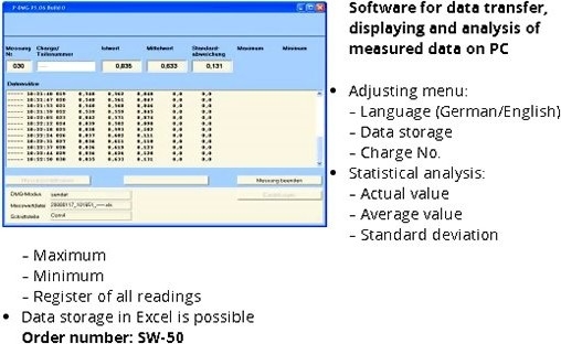 This alternative to the D-2010 does not have an illuminated, menu controlled touch-screen with its statistics functions, instead it is equipped with a dial gauge with seven-segment display and individual keys. Of course, there is a data output for the digital processing of the measurement results.