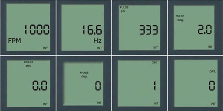 | Default Settings | FPM 1000, Hz 16.6, PULSE µs 333, PULSE deg 2°, DELAY ms 0.0, PHASE deg 0°, DIVIDER 1, OPTION 0 |