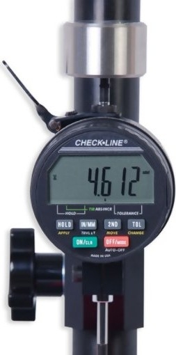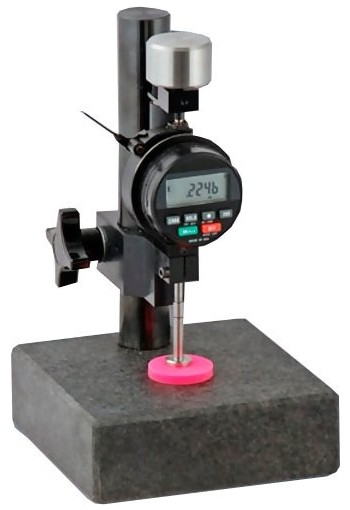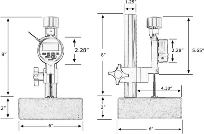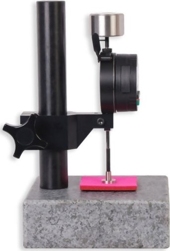 The certified digital indicator includes 3 SPC data output formats, English or Metric display, auto power-off, and a left-hand lifting lever. The indicator is fitted on an 8 inch (200 mm) tall column to allow the indicator to be raised or lowered to accommodate different size test specimens. The 6"x6"x 2" (150 x 160 x 50 mm) laboratory grade certified granite base offers a smooth and extremely hard reference plane for precise and repeatable measurements.