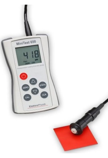 The rugged ElektroPhysik MiniTest 650 Coating Thickness Gauge follows its long-time proven predecessor model MiniTest 600 in the line of gauges with a fixed external probe offering measurement of all non-magnetic coatings on steel and all insulating coatings on non-ferrous metals. It is especially designed to work in rough environments as well as on on abrasive surfaces, e.g. shot-blasted steel, plasma spray coated surfaces.