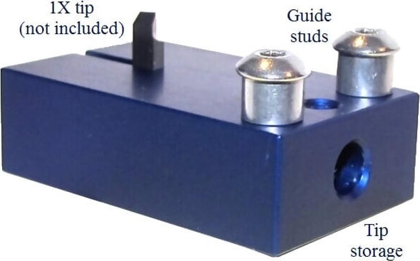 The tipholder has a tip storage compartment that can hold two tips. The wrench provided with the Tooke Gage is used to open and close the set screw that holds the tips in the compartment.