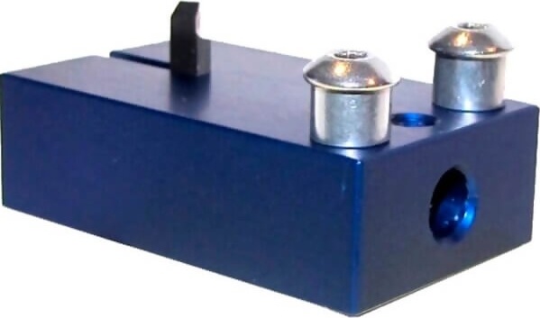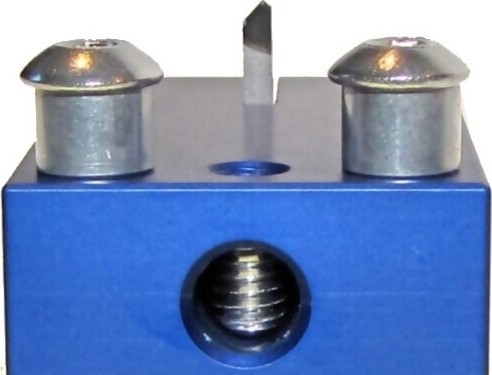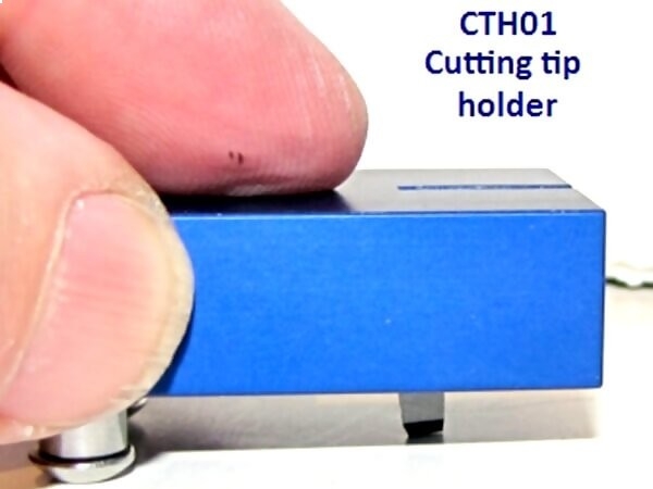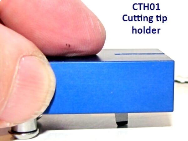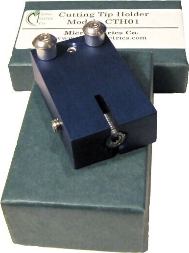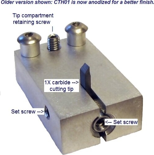 The cutting tip is held securely by set screws from the side and end of the cutting tip holder to provide 90-degrees of support. The tip storage compartment set screw is shown below raised to allow access to the stored tips