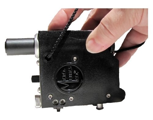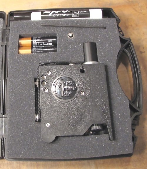 The molded polycarbonate plastic Gage body contains an illuminated microscope and mounts three tungsten-carbide cutting tips (that incise the “V-groove” for measuring) on the narrow side. Two guide studs project from the body on the same side as the cutting tips. The tripod thus formed by the three legs (guide studs and cutting tip) provides precise alignment of the tool with the surface to be grooved. A lanyard with keeper looped through the body secures the instrument to the inspector’s wrist. The entire unit is designed for convenience and completeness in field inspection tasks.