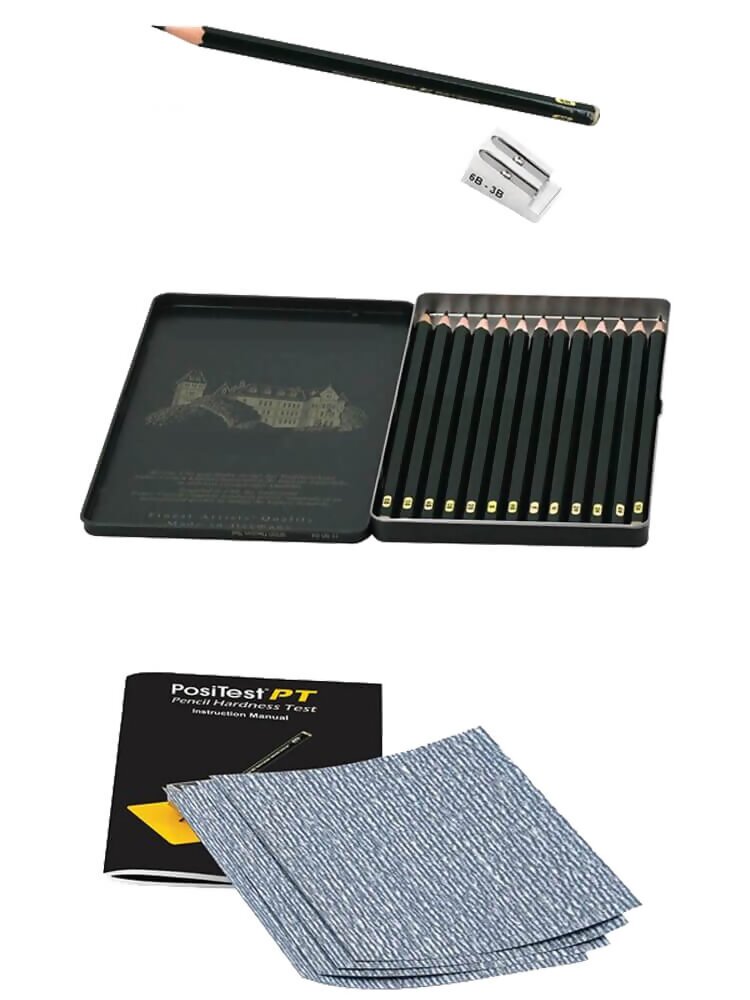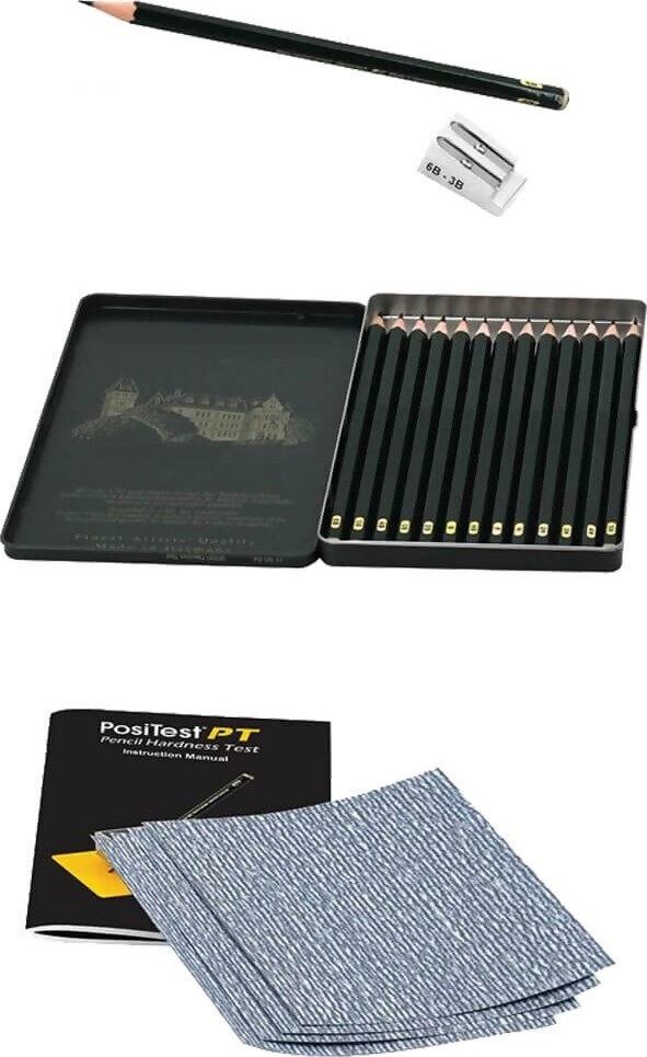 - 14 quality graphite pencils-6B to 6H hardness values – in a protective aluminum case-6B, 5B, 4B, 3B, 2B, B, HB, F, H, 2H, 3H, 4H, 5H, 6H