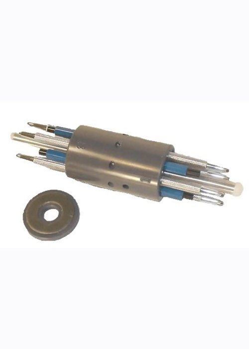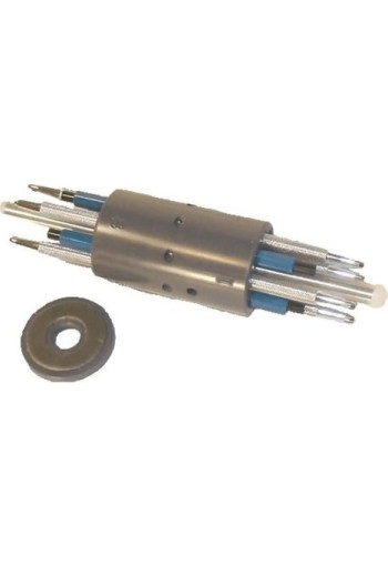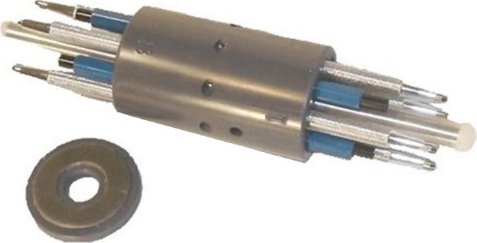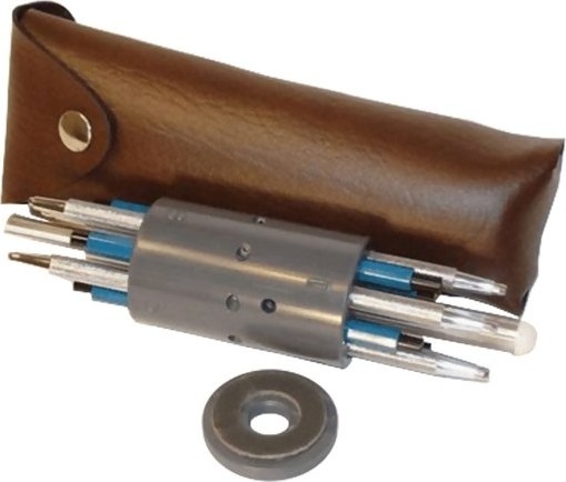 | Five small circular pieces of 400 grit carburundum paper mounted on a plastic dressing disk are provided to facilitate dressing the lead points while they are in place in the gage. |  |