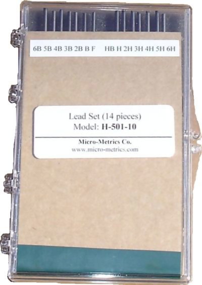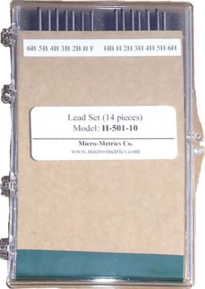 The leads supplied with the Micro-Metrics Pencil Hardness Gage/Gauge, listed from softest to hardest, are: