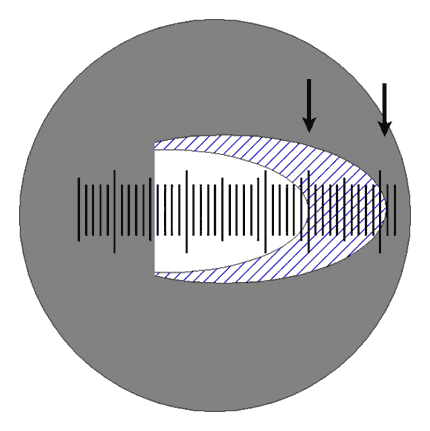 When the incision is examined with the Tooke Paint Inspection Gage/Gauge microscope, it will appear as a partial cylindrical cavity, with the cavity wall angling gradually upward to the paint surface. Where the wall of the cut penetrates the substrate surface, the paint film above it describes a crescent shape. The crescent shape is cross-hatched in the drawing below. The thickness is correctly read axially across the thickest part of this shape.