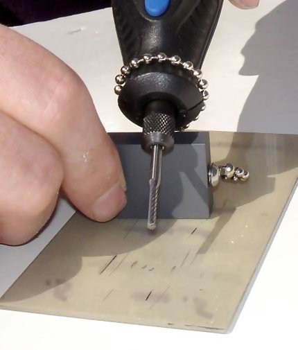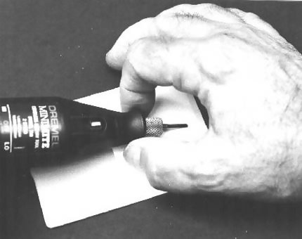 | The high-speed cutter, usually with either tungsten carbide or diamond-studded surfaces, “erodes” away surface material in a precise pattern, leaving adjacent and underlying areas totally undisturbed. Hard, brittle, tough, fibrous, tender, or elastomeric materials exhibit clean, non-tearing, controlled disintegration under the rotary cutter. | For precise and rapid measurements, a “drum mode” of cutting was developed. In this mode the grinder is fitted with the No. 9902 tungsten carbide cutter (or equivalent) installed in precise position. With the round rim of the Microgroover in continuous contact with the work surface, the unit is pivoted until the tip contacts the surface. A light touch with the rotating tip creates the required incision.