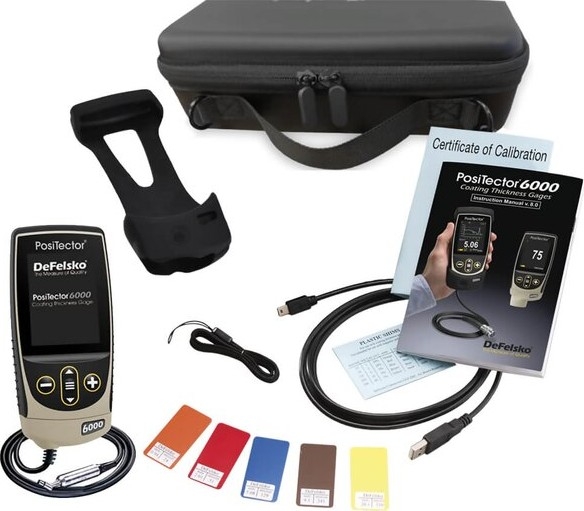 The DeFelsko PosiTector 6000 F45S1 Standard Coating Thickness Gage Kit includes everything needed for testing: