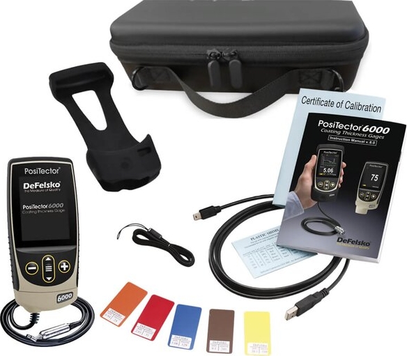 The DeFelsko PosiTector 6000 F45S3 Advanced Coating Thickness Gage Kit includes everything needed for testing: