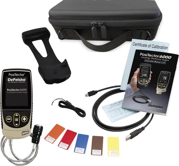 The DeFelsko PosiTector 6000 FHXS1 Standard Coating Thickness Gage Kit includes everything needed for testing: