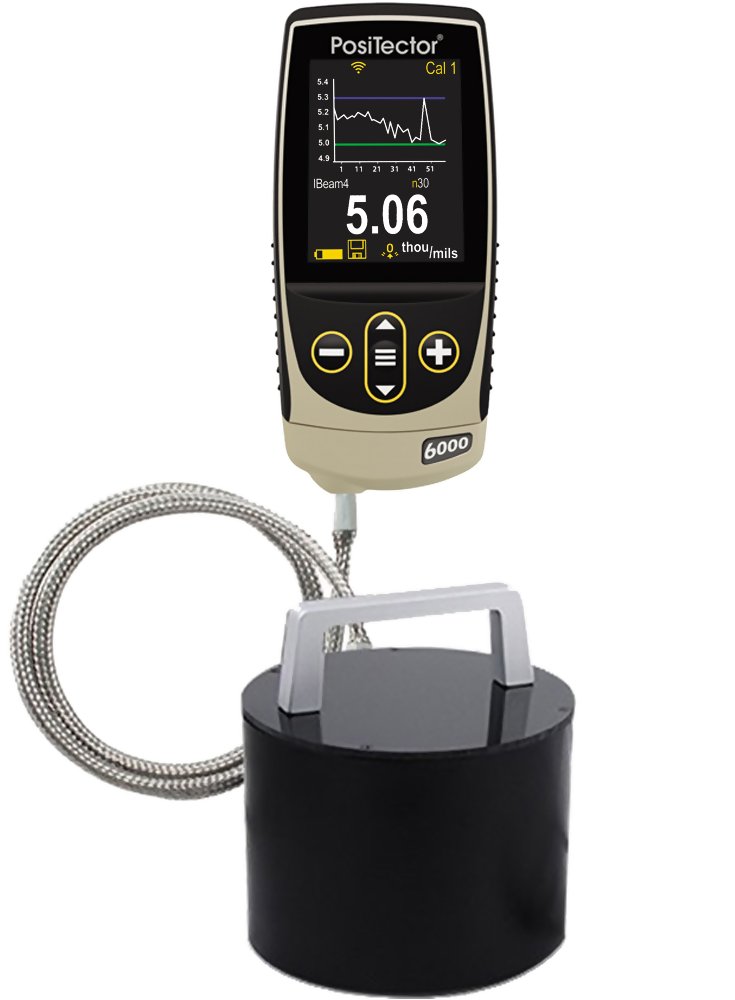 The coating thickness measurement range of the DeFelsko PosiTector 6000 is dependent on which interchangeable probe is attached. DeFelsko PosiTector 6000 probes are available for measuring a wide variety of coating thickness applications.For example, the DeFelsko PosiTector 6000 FN probe can measure coating thicknesses up to 1500 um (60 mils), while the DeFelsko PosiTector 6000 FNGS probe measures coatings up to 63.5 mm (2.5 inches) thick. No matter your application, DeFelsko likely has a measuring solution to satisfy your requirement.