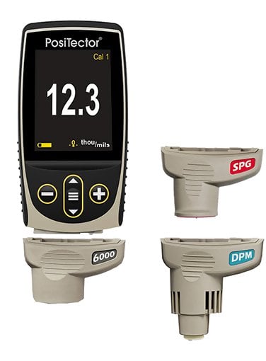 The PosiTector body accepts the PosiTector 6000, DPM, and SPG probes included in the kit easily converting from a coating thickness gauge to a dew point meter or surface profile gauge.