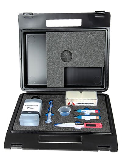 Bresle Test is supplied in an industrial Carrying Case with Bresle Patches (pack of 35), Horiba Conductivity Meter, Deionised Water (500ml), Syringe with Needle, 1413μS/cm Calibration Solution (14ml), Conditioning Solution (14ml) and Beaker.