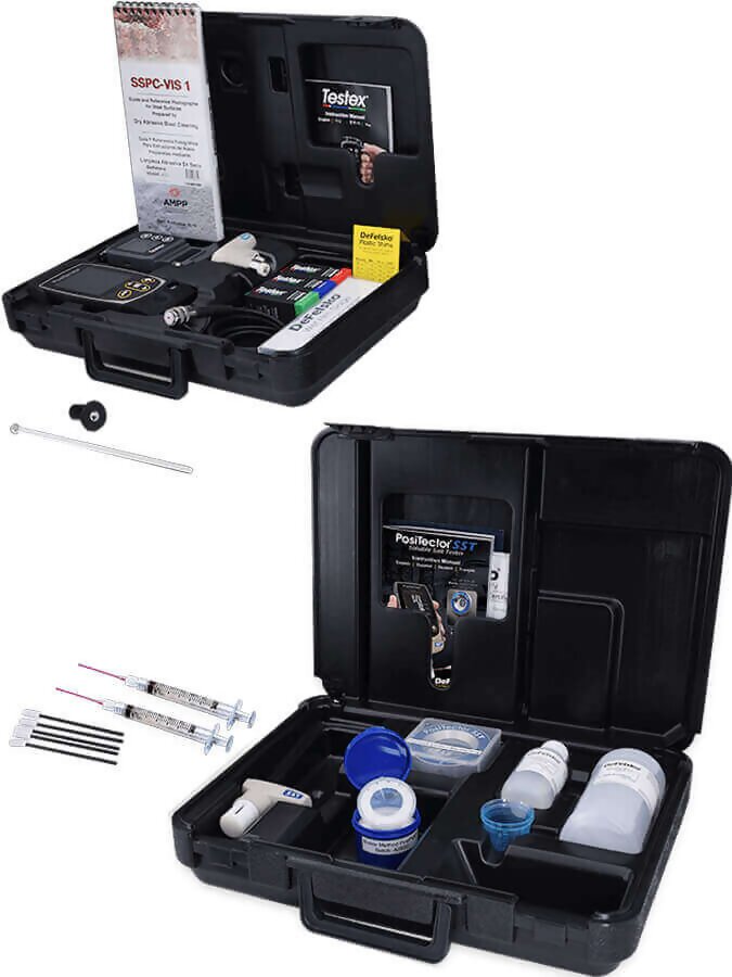 The DeFelsko KITSSPFS3 PosiTector Advanced Steel Structure Painting Inspection Kit is for Dry and Wet Film Thickness, Environmental, Soluble Salt, and Surface Profile Evaluation. DeFelsko KITSSPFS3 PosiTector Advanced Steel Structure Painting Inspection Kit feature the most popular instruments for measuring wet and dry film thickness, surface profile, environmental conditions, salt contamination, and include an SSPC VIS 1 Visual Reference Standard—delivering a complete solution for structural steel coating inspection.