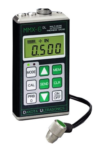 Measuring Range in Steel Pulse-Echo Mode (Pit & Flaw Detection) measures from 0.025 to 19.999 inches (0.63 to 500 millimeters). Echo-Echo Mode (Through Paint & Coatings) measures from 0.1 to 1 inch (2.54 to 25.4 millimeters). The new Dakota Ultrasonics MMX-6DL Data Logging Through Paint Ultrasonic Thickness Gauge accurately measures wall thickness and the extent of corrosion of all metals, ceramics, glass and most rigid plastics - from only one side! The MMX-6DL can be used in a Single Thickness Reading mode or in a Scan mode, where the probe is dragged over a large measuring area. The minimum thickness reading recorded during the "scan" will be displayed. The MMX-6DL incorporates a built-in memory for 1000 data points that can be separated into 10 separate "batches." The stored data can be downloaded to a serial printer or a personal computer. A Windows compatible data transfer program is supplied at no additional cost. The MMX-6DL probe is waterproof and can be submerged in water. The gauge is impact-resistant and environmentally sealed to provide trouble-free operation under the toughest field conditions.