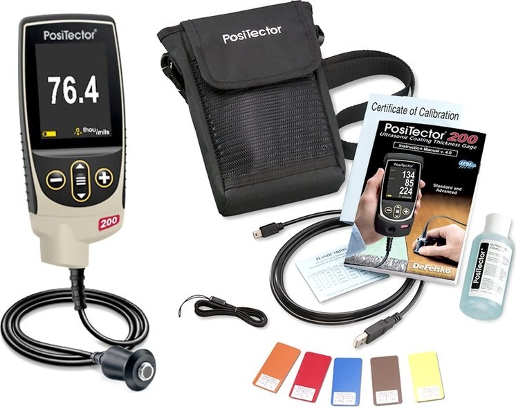 The DeFelsko PosiTector 200 C1 Standard Ultrasonic Coating Thickness Gage Kit includes everything needed for testing: