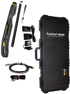 The DeFelsko PosiTest HHD High voltage Holiday Detector uses pulse DC technology to detect holidays, pinholes, and other discontinuities on metal and concrete substrates