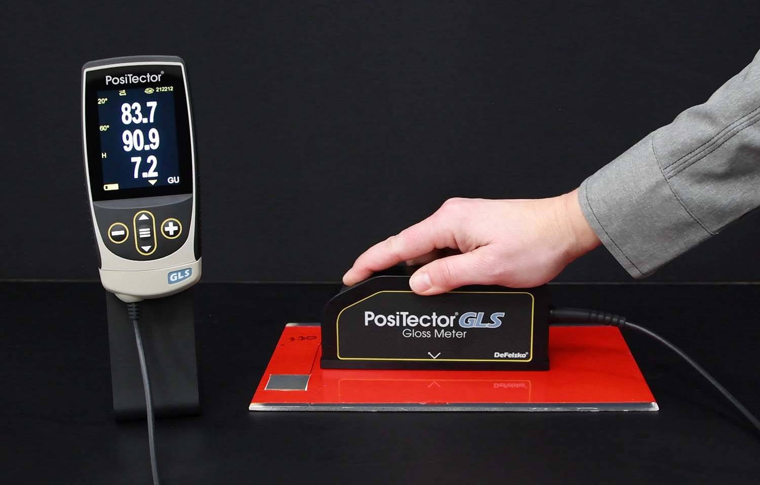 Digital gloss meters like the DeFelsko PosiTector GLS Gloss Meter measure the surface using a calibrated light source and light sensor at opposite, specular angles to each other. Reflectance is determined by comparing the amount of light energy emitted by the source with the amount of energy received by the sensor. Gloss is then automatically calculated using a look-up table.