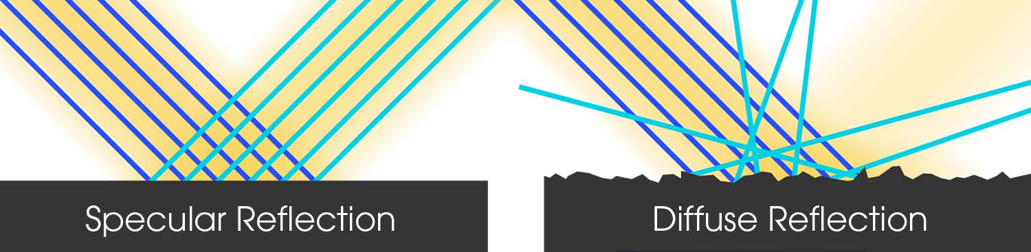 | When light hits a surface, some of it is absorbed, and some is reflected. The reflected light is responsible for how the object is perceived. The nature of the reflection is generally related to the surface finish of the object. On a smooth, polished surface like a mirror, light is reflected opposite to the angle at which it arrives; this is referred to as ‘specular’ reflection. On a rough surface, light is reflected at all angles and a relatively small amount of light reflects at the specular angle. |
