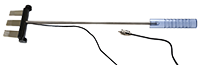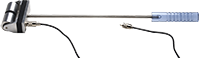 Electrode handle that attaches to the built-in connector on the top of any moisture meter. Can be used with the 830 series prods, 831 short pin disc shaped prod, and 832 long pin disc shaped prod. This is useful for large or high density bales of hay or scrap paper. Two handed operation is recommended over using a prod that connects directly to the top of the meter (like our 1235 series) to minimize stress placed on the meter casing.