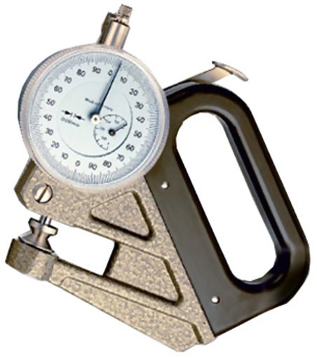 Special-purpose thickness gauge for foils and thin materials with a resolution of 0.001 mm. An insulated handle prevents transfer of heat from the hand to the movement.