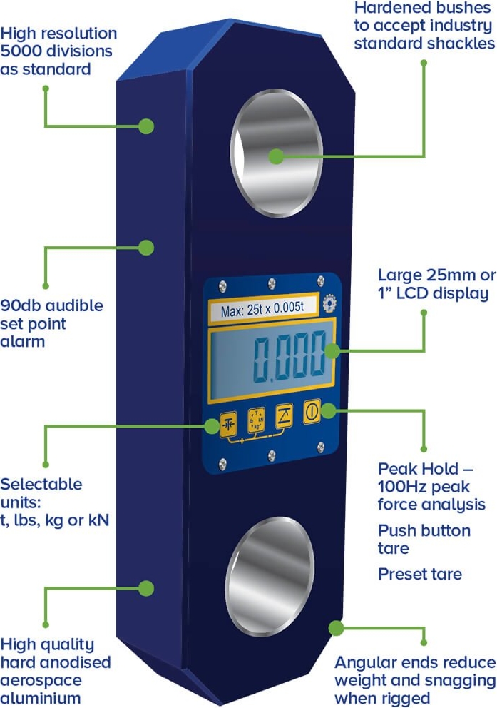 This range of digital dynamometer load cells are used on a daily basis for load monitoring, weighing and heavy lifts ranging in capacity from 1 to 300 tonnes, by a variety of industries including rigging, shipping, transportation, offshore and onshore oil and gas, utilities, aerospace and mining.