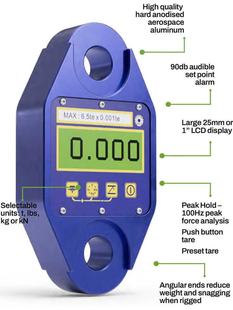 Providing accurate load measurement and incident and injury prevention this dynamometer is rigged using industry-standard shackles such as Crosby G2130, the compact design minimizes headroom loss (6.14” or 156mm from eye to eye).