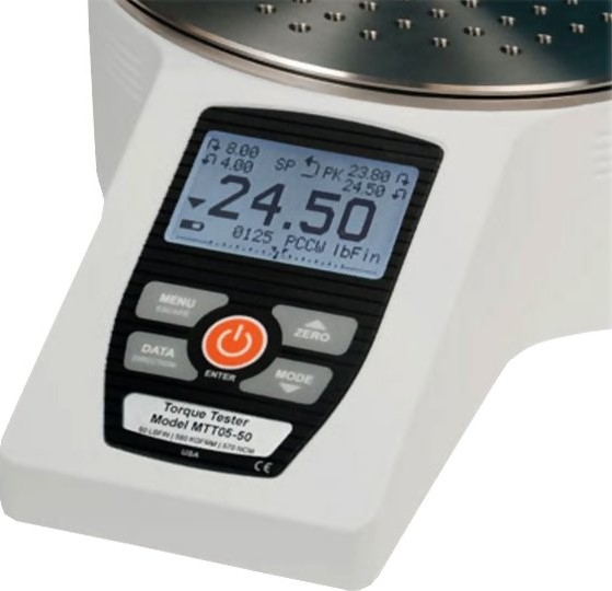 Series TT05 universal torque testers can be used for a range of applications up to 100 lbFin [11.5 Nm]. The stainless steel loading surface features a matrix of threaded holes, ideal for accommodating specialized fixtures and attachments. The testers' rugged design and simple, intuitive operation allow for use in laboratory and production environments.