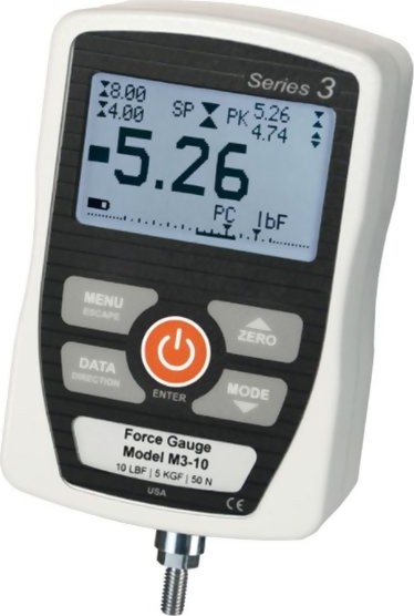 The Mark-10 Series 3 Digital Force Gauge are designed for measuring tension and compression (push & pull) force testing in numerous applications from 0.12 lbF to 500 lbF (0.5 N to 2500 N). The gauges feature a sampling rate of 2,000 Hz, producing accurate results under a wide range of test conditions. The Mark-10 Series 3 backlit graphic LCD displays large characters, and a menu is available to access the gauges’ features and configurable parameters. USB output (non-streaming) is provided for data collection purposes.