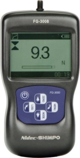 The Shimpo FG-3000 Series digital force gauges are the choice for simple, economical tension and compression testing. Combining a compact housing, yet maintaining a large back- lit LCD screen, these units are designed to fit snug in the hand for ease of use. The multi-language Shimpo FG-3000’s provide menu programming for intuitive set-up of the instrument to your desired requirements. Three modes of operation are available: Track mode displays live readings, Peak mode records the maximum values sensed during testing, and Pre-set mode, which activates user defined high and low limit set points. The programmable limits provide a fast visual and audible alert if a test passes or fails. Additionally, a comparator output enables integration of the instrument into your quality system for repetitive testing, for example production lines.