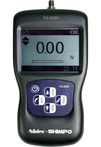 The new Shimpo FG-3000R Digital Force Gauge are the choice for simple, cost-effective compression testing. Combining one of the most compact housings, yet maintaining a large back-lit LCD, these units were designed to fit perfectly in the hand for ease of use. The integral button style load-cell attached via the flexible, metal braided cable enables readings to be taken in machinery or fixtures where other force gauge adapters are unable to reach or fit. The multi-language FG-3000's provide menu programming for intuitive set-up of the instrument to your desired requirements. Three modes of operation are selectable: Track mode displays live readings, Peak mode records the maximum reading sensed during the test, and Pre-set mode which activates user defined high and low limit set points. The programmable limits provide a quick visual and audible indication if a test passes or fails. In addition, a comparator output enables integration of the instrument into your quality system for repetitive testing such as on production lines. The display graphics facilitate user comprehension and operation. An analog bar graph provides perspective of current reading in comparison to the full scale range. Pass/Fail icons provide an instant response of the testing outcome while a storage symbol acknowledges when a reading is logged. A menu-selectable display orientation streamlines switching from push to pull testing for portable or test stand applications.