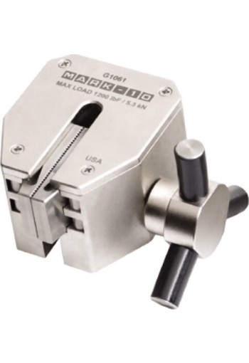 The Mark-10 G1061 Heavy Duty Self-Tightening Wedge Grips are ideal for a range of tensile testing requirements. The serrated steel jaws are easily opened with an ergonomic spring loaded knob and rack and pinion type mechanism. The jaws ride on rollers instead of sliding along the surface of the housing, as with conventional wedge grips. This unique design prevents jamming and improves gripping characteristics.