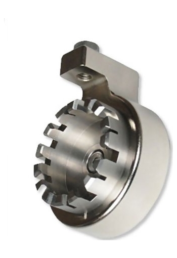 The Mark-10 G1076 Wire Terminal Grip is designed for securing wire terminals, cables, connectors, and other samples for pull testing. Grooves of multiple sizes are provided to accommodate a wide range of wire diameters up to 0.25 in. (6.3 mm). Simply rotate the turret wheel to the desired size. Integrated magnets hold the wheel in place to help prevent accidental rotation to a different sized groove.