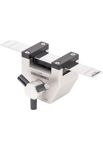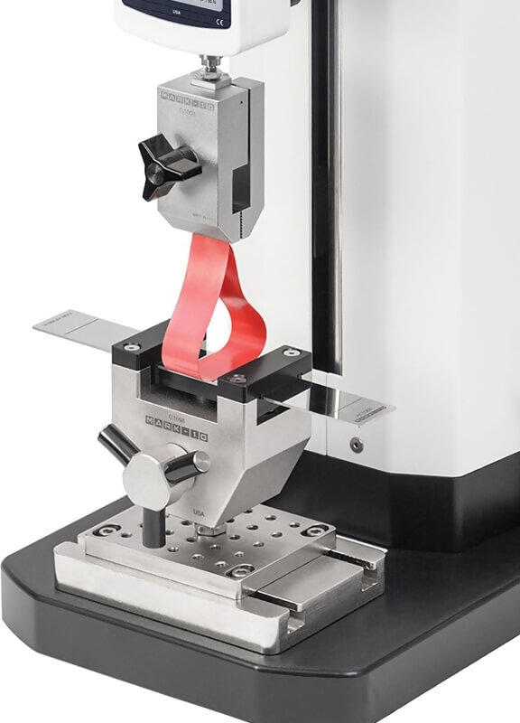 The Mark-10 G1098 ASTM D6195 Loop Tack Fixture is designed for tack force testing of pressure-sensitive adhesives, in conformance with ASTM D6195 and related standards. A looped sample is loaded onto the test strip, and the closed end of the loop is secured by an upper grip (not included - suggested model: G1008). The test strip may be indexed in three positions, allowing for three tests to be performed between cleaning cycles. The strip is secured and released by a lever-operated clamp. An additional set of three test strips is available.