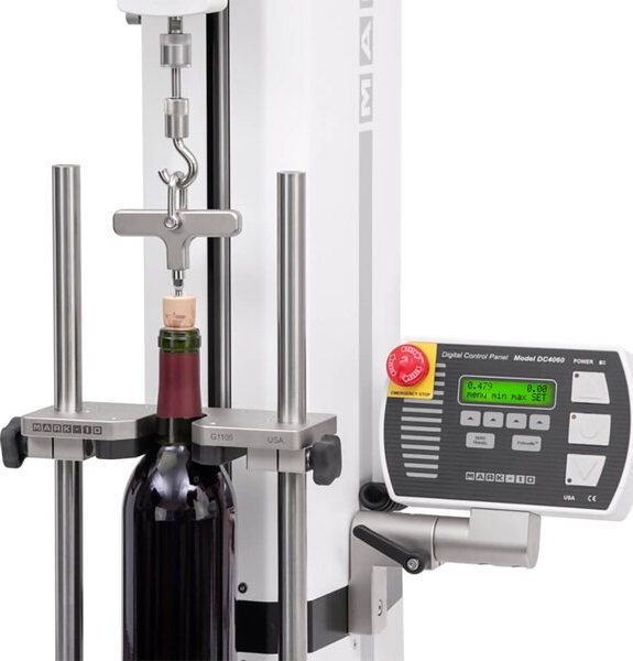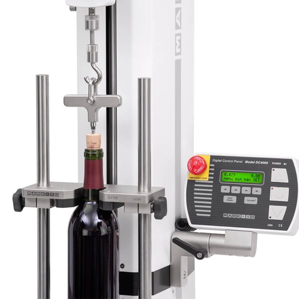 The Mark-10 G1105 ISO 9727 Cork Pull Fixture accommodates up to 1.5 L bottles, and is compatible with both natural and synthetic stoppers.