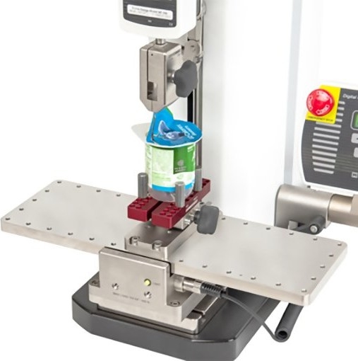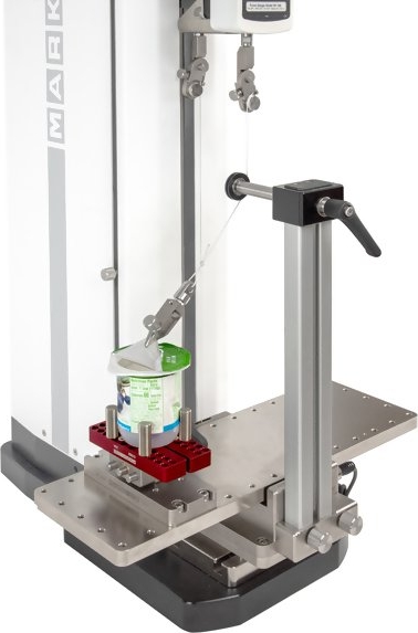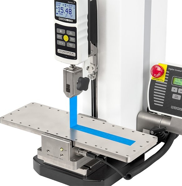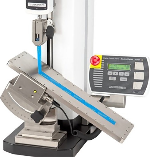 An optional adjustable-angle mount tilts the fixture up to ±30°. Another optional adapter uses an adjustable pulley to set the angle of pull, from 0° to 90°, while the working table remains horizontal. The horizontal orientation is suited for seal testing of filled containers, and can also be used for tapes and other materials.