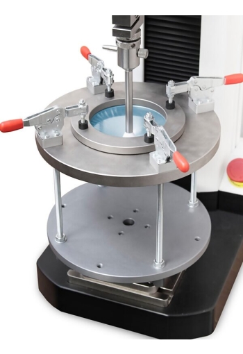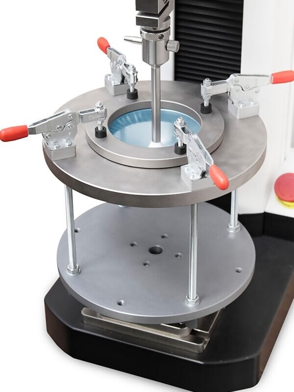 The fixture’s generous height accommodates materials with long elongation. Four toggle clamps and a compression ring with concentric ridges effectively secure the material, while the included plunger with ball probe stretches and ruptures the sample.