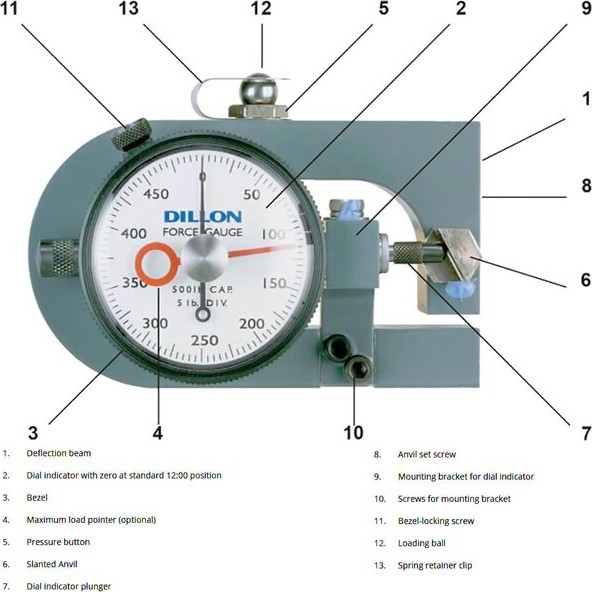 A precision dial indicator is mounted at the null point of the deflection beam. The indicator plunger rests against a slanted anvil at the open end of the beam, as shown in the photo. Under compression loads, the two halves of the beam tend to close. Tension force causes them to move apart. This action pushes the plunger inward, as determined by the slant of the anvil. Readings produced on the dial are in direct relation to applied load. The pointer revolves 360° clockwise under compression or tension forces. Push-pull gauges read half scale (180°) clockwise in compression, and counterclockwise, 180° from center zero under tension loads.