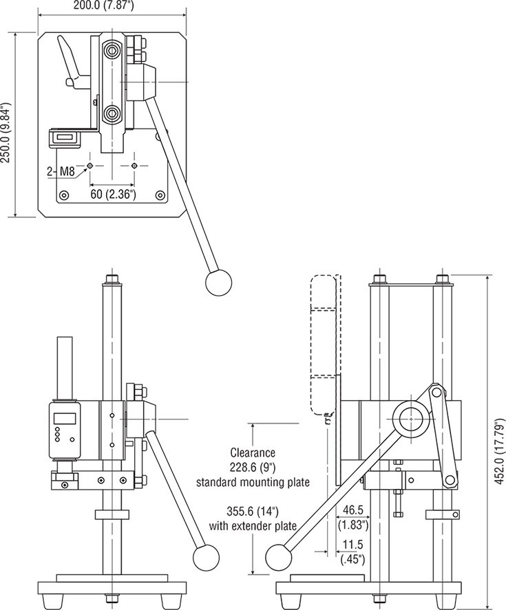Model Imada NLV-220 vertical manual lever test stands provide maximum versatility and reliability. Lever action provides quick, consistent testing. A pull down on the lever creates either compression or tension, depending on the model. A return spring resets the lever on compression models. The stands will accommodate any of the standard range force gauges and can be equipped with a precision digital distance meter. The optional extender plate increases clearance to 14" for larger samples. The Imada NLV-220 is perfect for compression and tension applications where rapid action is desired.