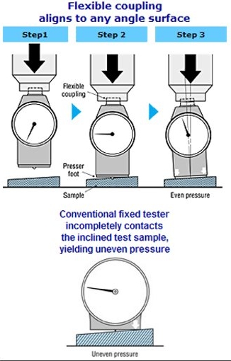 Unique flexible coupling system automatically aligns the presser foot to the surface of sample