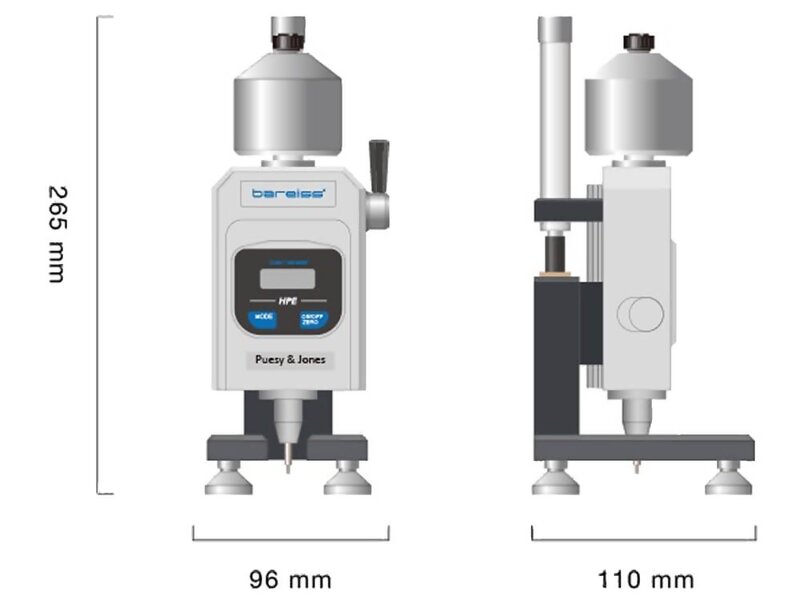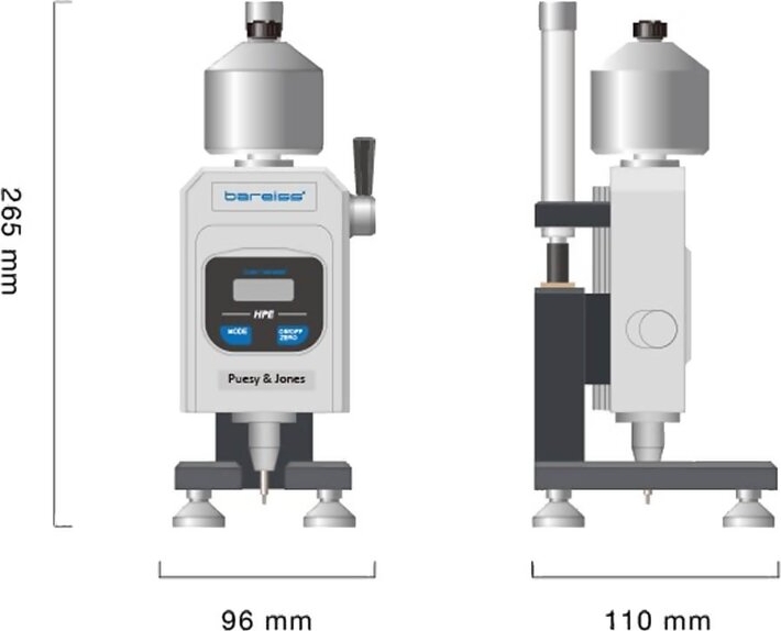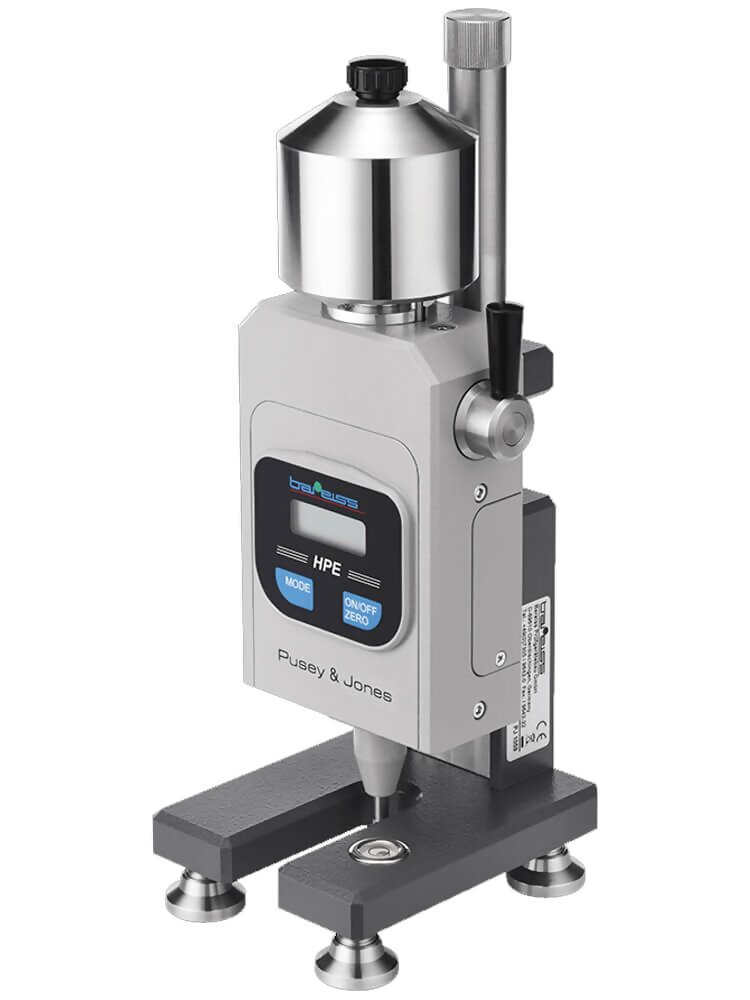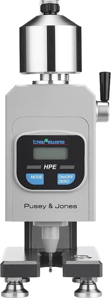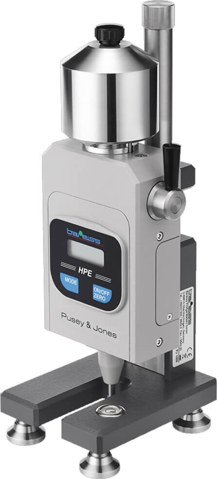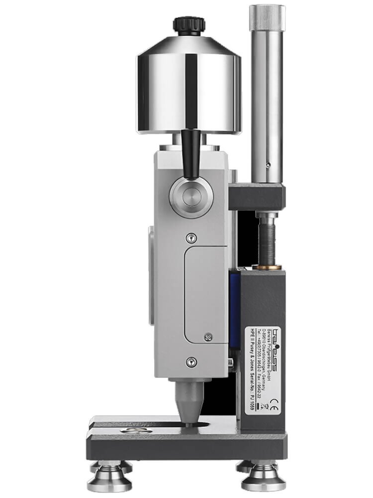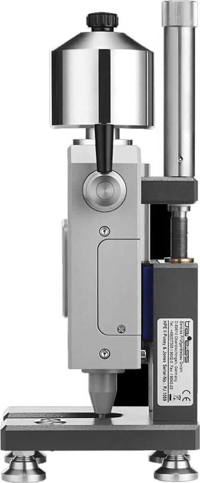 The Bareiss HPE-PJ Pusey & Jones Hardness Durometer Tester Plastometer is designed for testing the hardness of rubber and rubber-like materials. It is typically used for testing rubber rollers used by the paper industry. It can also be used for testing specimens with a flat surface and thickness of 13 mm.