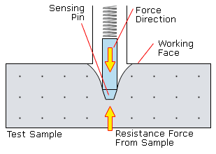 The principle used to measure hardness is based on measuring the resistance force of the penetration of a pin into the test material under a known spring load. The amount of penetration (max. 2.5 mm) is converted to hardness reading on a scale with 100 units.