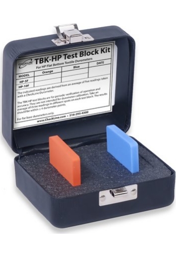 The Checkline TBK-HP is for periodic verification for HP Textile Durometers with flat bases (models HP-5F and HP-10F). The test block kits gives the user the ability to develop the proper "feel", and, while they are not to be used for calibration purposes, they enable the user to perform a quick check for proper durometer operation. A large variation would indicate the need for recalibration of the durometer being utilized.