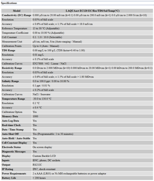 ModelLAQUAact EC120 EC/Res/TDS/Sal/Temp(°C)