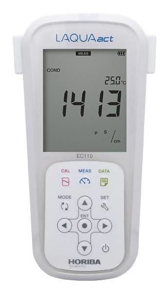 The Horiba LAQUAact EC-120K Portable Water Quality Conductivity / Resistivity / Salinity / TDS Meter is designed for use with one hand and with an IP67 waterproof rating and shock-resistant casing. The EC-120 meter can be used for long periods, even in dark places, making it ideal for field measurements in rivers and lakes.