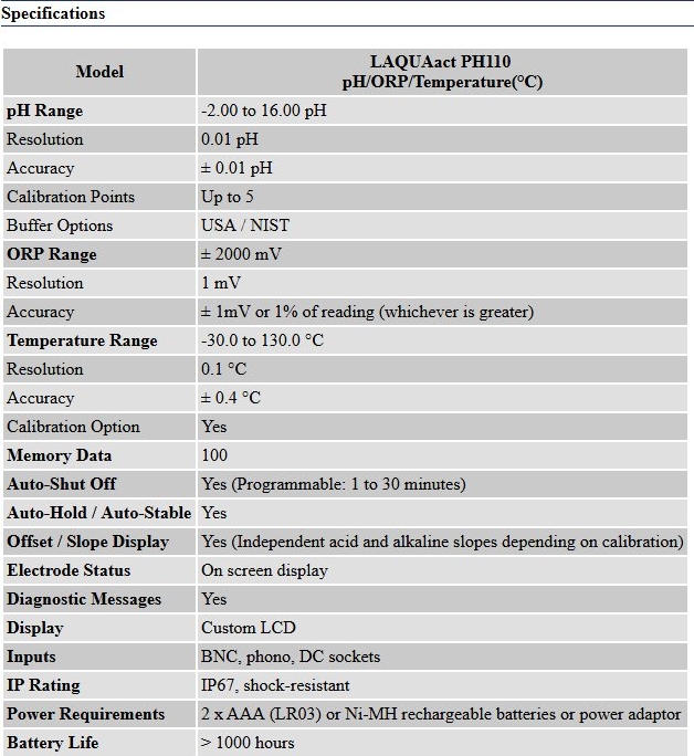 Horiba LAQUAact pH-110K Portable Water Quality pH Meter Kit 3999960167 - Brochure