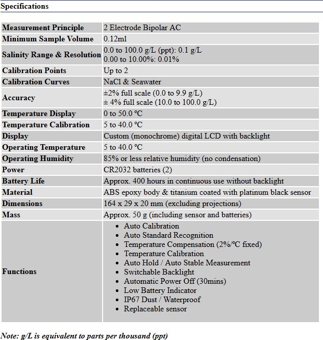 Salinity Range & Resolution0.0 to 100.0 g/L (ppt): 0.1 g/L